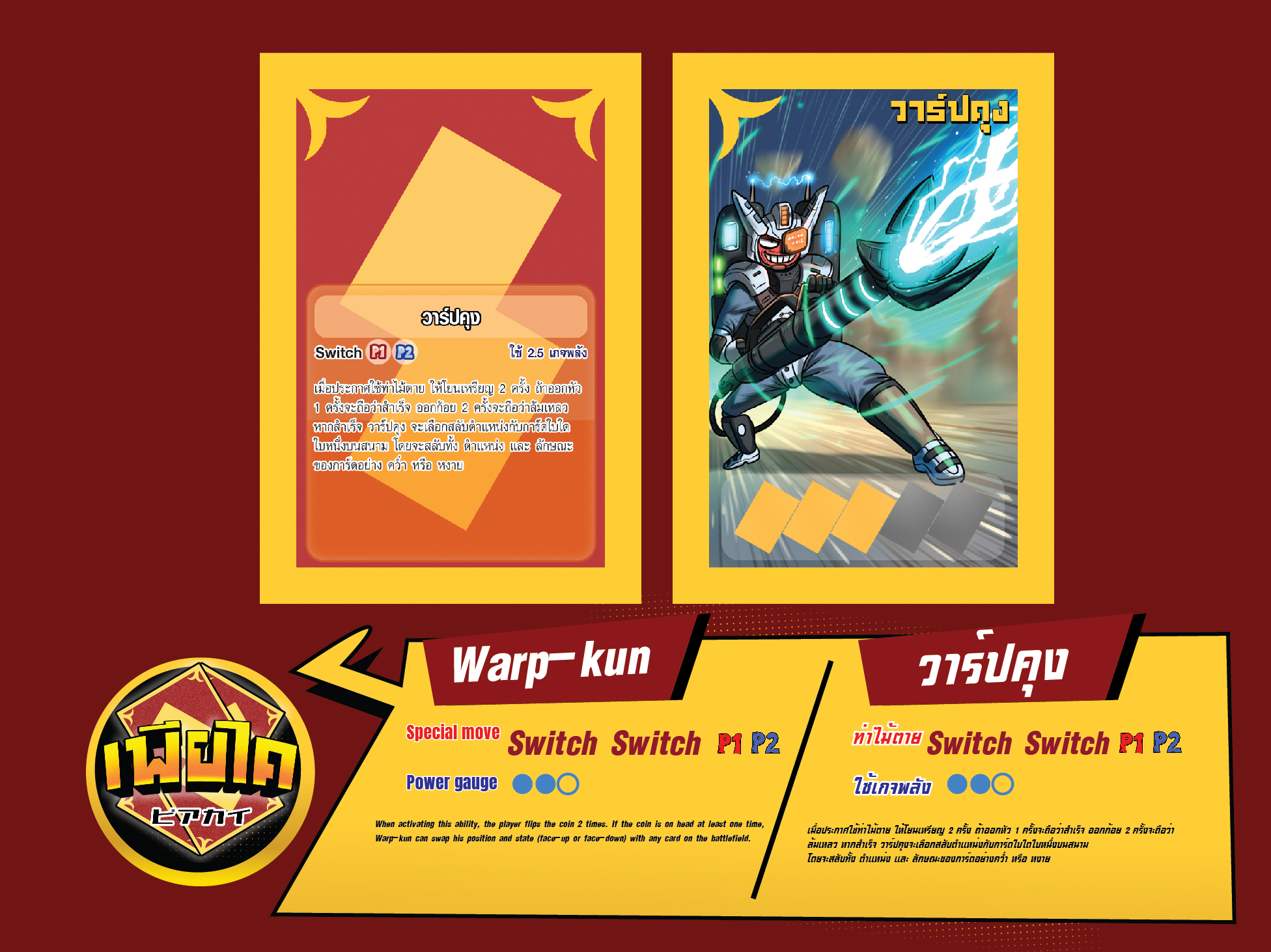 When activating ability, the player flip the coin 2 times. If the coin is head at least one time, Warp-kun can swap his position with any card on the battlefield. This also apply to the state of the card (face-up or face-down).